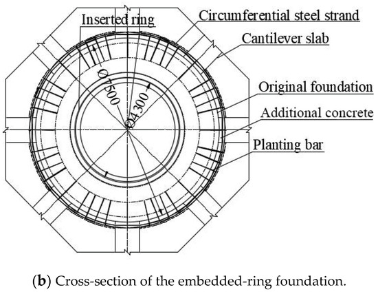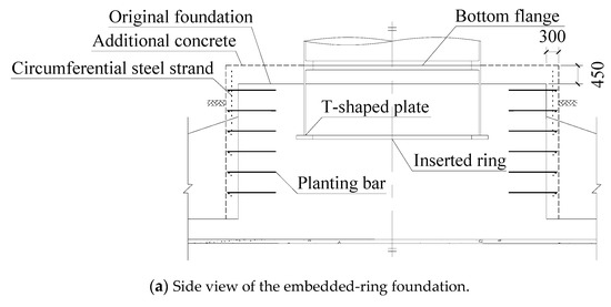 The retrofitting measure most commonly used in embedded-ring foundations is to drill holes on the top surface of foundation piers and pump cement slurry to fill gaps and cracks. This method can have an immediate strengthening effect, but the gaps and cracks will occur again in a short time because the force transmission mechanism between the steel embedded-ring and the concrete foundation pier is not changed. Kang et al. [