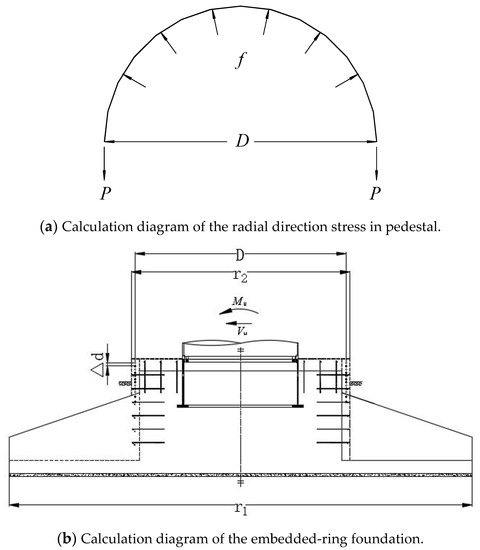 14]. In this paper, a circumferential prestressing technique is proposed to exert on the pier of the beam-slab spread foundation. Beforehand, the gaps and cracks on the foundation pier should be filled and repaired using high strength epoxy resin with better elasticity than concrete. In order to reduce the pressure stress of the concrete on and beneath the T-shaped plate, the overturning moment resisted by the lateral pressure of the foundation pier contacting with the steel ring should be increased by increasing the embedded depth of the steel ring. Because the bolts of the bottom flange may become loose during the wind turbine’s operation, regular inspections should be carried out over the whole service life. Therefore, the concrete foundation pier is proposed to be heightened to the bottom flange of the steel tower by planting reinforcing bars as far as possible, thereby increasing the embedded depth of the steel ring in the wind turbine foundation. Finally, the circumferential prestressed steel strands are arranged on the lateral surface of the column pier to remove or reduce the tensile stress generated by external loads, as shown in