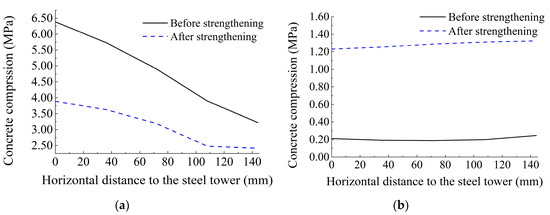 The compressive stress and the fatigue strength of concrete above the windward-side T-shaped plate before and after strengthening are shown in