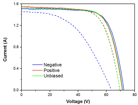All the modules have been characterised at STC conditions. Figure 6 shows the I-V curves of three modules tested inside the climatic chamber with both negative (front contact of the first test) and positive (front contact of the second test) bias of 1000 V, and an unbiased module used as a reference. As shown in Figure 6, both the positive biased module and the unbiased module show similar behaviour with slight degradation, mainly due to the expected effect of high temperature and relative humidity inside the environmental chamber. On the contrary, the negative bias drives the sample to degrade significantly at the end of the test compared to the other samples. These results reveal that the high negative voltage induces PID degradation, in the CIGS modules under tests, with a remarkable power loss similar to the power losses in the crystalline silicon modules from different manufacturers. It is worth noting that the PID affected modules have not shown any visible discoloration.