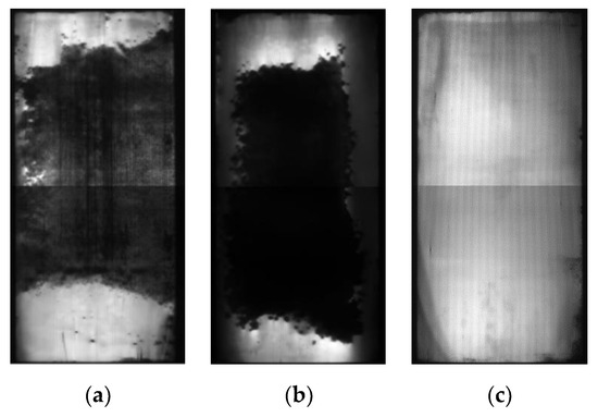 Electroluminescence images of the PV modules after the recovery test: (a) back contact, (b) front contact, and (c) frame contact.