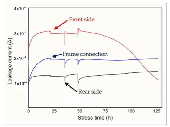 A third analysis has been carried out on the leakage current flowing during the PID test (voltage 1000 V, temperature 85 °C, relative humidity 85%) which increases the surface conductivity of the modules. The leakage currents known as the transferred charges from the active layer to the frame, are plotted in Figure 11; these leakage currents are related to the PID effect. The highest current has been observed for the front contact configuration and corresponds to high degradation as displayed in Figure 8. Furthermore, the back contact module shows less flow: as both front and back connections cause significant degradations, this reveals that the leakage current through the back contact is most harmful than the front contact, and the power loss needs less transferred charges [38]. The frame contact module shows the smallest leakage current which is related to a small degradation in the first test. These results could give a correlation between power loss and the leakage current flowing under high voltage during PID test.