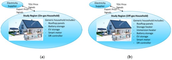 (a) On-gas and (b) off-gas households adopting demand response scheme and EV. TOU: time of use, EV: electric Vehicle, DR: demand Response.