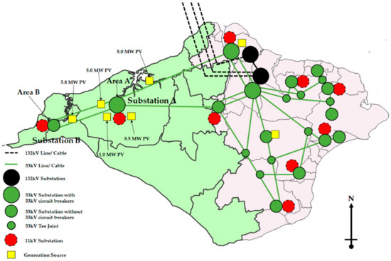 Isle of Wight (IoW) electrical distribution system-network map. The IoW study area is highlighted in green. Locations of assets and routes of overhead lines, underground cables and submarine cables are approximate indications for information only. PV—Photovoltaic, MW—Megawatt, kV—Kilovolt. Image produced using data from Grontmij (2010) [31].