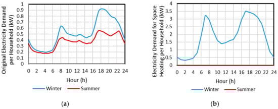 This DR study considers both on-gas and off-gas households. Currently all off-gas households are assumed within this study to be heated using higher cost (comparatively to on gas properties), carbon-intensive fuels, such as on-peak electricity, oil and LPG. Households are assumed to adopt an appropriate subset of the aforementioned devices, technologies, or schemes (Figure 1), so that they can participate in the DR scheme. For an average household located at the study region, the estimated original electricity demand before including the proposed smart appliances [32], space heating demand [33], hot water demand, and power generated by a 3 kWp PV array [34] are shown in Figure 4, for the cases of summer and winter.