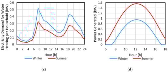 (a) Original electricity demand before including the smart appliances, (b) space heating demand, (c) water heating demand, and (d) power generated by 3 kWp PV array for an average household located at the study region.