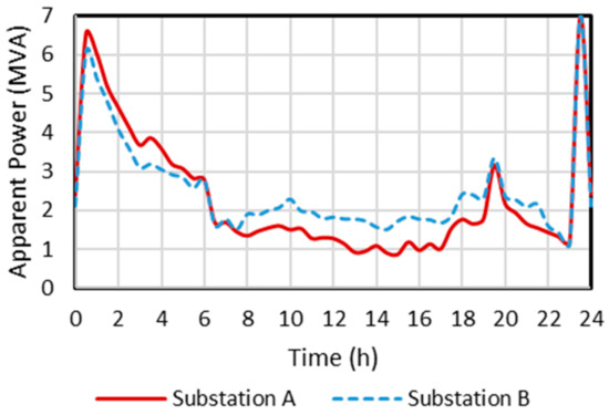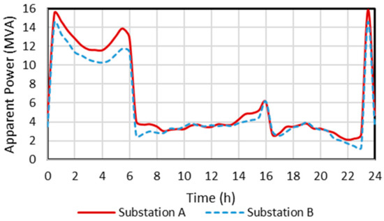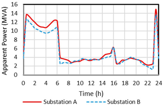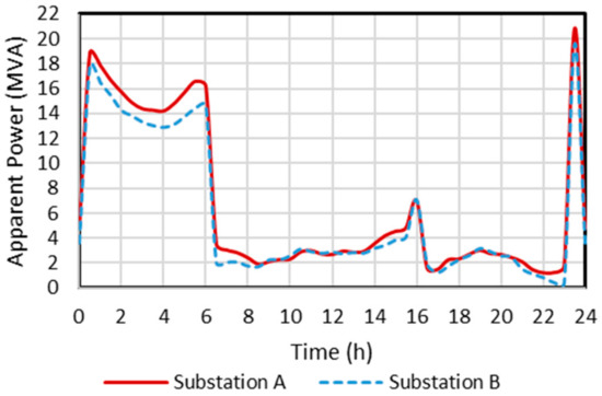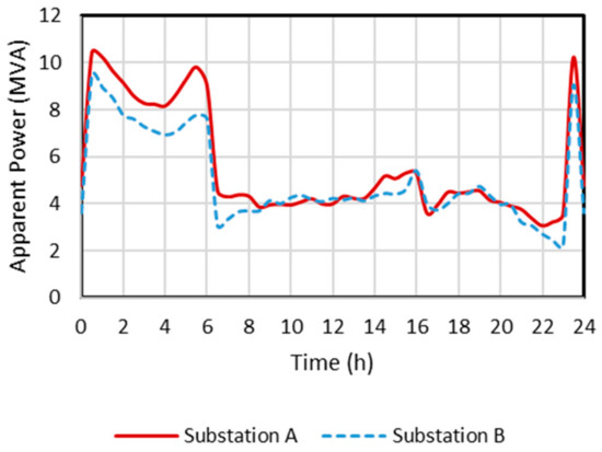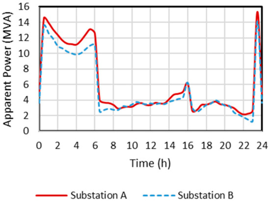 The apparent power flows through transformers after implementing DR are plotted in Figure 5 for both substations. The results show that the DR optimization has shifted the electricity demand towards late night when electricity is cheaper. The minimum apparent power flows after DR are decreased to 2.1 and 1.3 MVA for substations A and B respectively. The maximum apparent power flows after DR are increased to 15.4 and 14.2 MVA for substations A and B respectively. It is seen that even after adopting the DR and new devices, the maximum apparent power flows are 51% and 47% of the combined transformer power rating of substations A and B respectively.