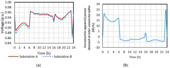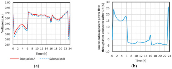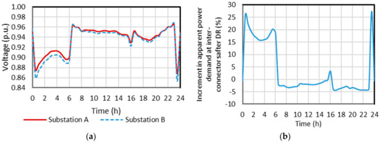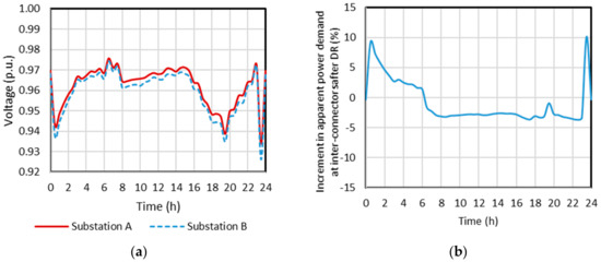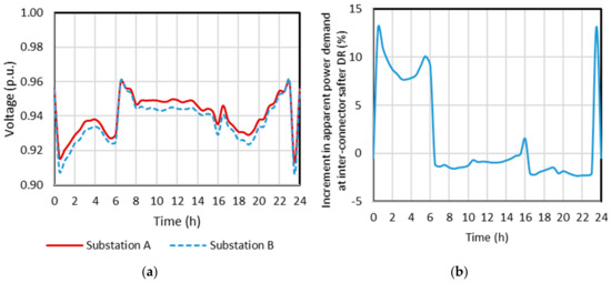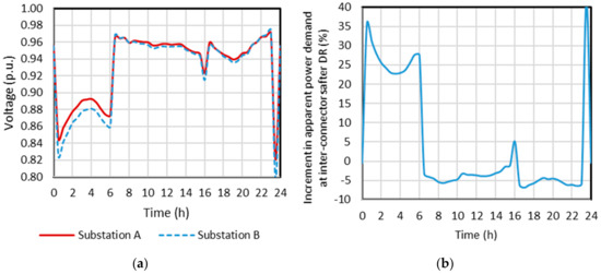 (a) Secondary voltage at transformers of both substations and (b) increment in apparent power flow through inter-connectors after the implementation of DR for scenario 6.