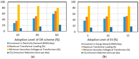 Figure 18a shows that the increment in electricity demand increases linearly with the level of adoption of the DR scheme, as do the CO2 emissions reductions and maximum transformer loading at the substations. Moreover, the minimum voltage level at the secondary of the transformers at substations decreases with increase in the level of adoption of the DR scheme. A similar sensitivity is noted with changes in the level of adoption of electric vehicles, as shown in Figure 18b.