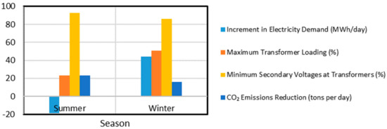Figure 19 shows that the electricity demand due to the demand response scheme and new devices increases significantly from summer to winter, as does the maximum transformer loading at the substations. The minimum voltage at the secondary of transformers at substations decreases visibly. It can also be seen that the CO2 emissions reduction is higher in summer due to higher solar electricity generation.