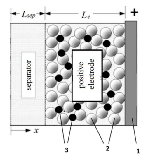 The model scheme, 1—a current collector, 2—particles of the active cathode material, 3—particles of added carbon black.