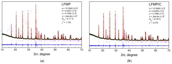 Rietveld refined X-ray powder diffraction (XRD) patterns of carbon-free LiFe0.5Mn0.5PO4 (LFMP) (a) and carbon-coated LiFe0.5Mn0.5PO4/C (LFMP/C) (b).