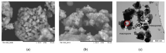 The results of the microstructural analysis of the as-prepared samples are shown in Figure 3 indicating the pronounced morphological differences. According to the SEM study, the samples consist of the submicron primary particles agglomerated in the micron-sized secondary particles. The particles of the LFMP sample acquire a rod-like morphology, while they are noticeably smaller and have an irregular shape for the carbon composite LFMP/C indicating that the carbon additive acts as a surfactant during MA and inhibits the sintering of particles upon the subsequent heat treatment. It is evident that these two samples differ by the pore size as well. The evolution of the CO2 gas during the milling and heating processes and nano-structuration lead to the formation of the special porous network structures. The formation of meso- and macropores in the LFMP/C sample are clearly seen in the TEM image (Figure 3c).
