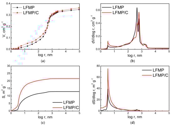 Both samples contain three maxima on the dV/dlogr plots: (1) logr < 1, (2) 2.6 < logr < 2.8, and (3) logr > 2.8 (Figure 4). Carbon black contributes to the first maximum as it has a very high specific surface area of 833 m2·g−1 [24]. In the mesopore and macropore regions, the LFMP/C sample has a pronounced regular bidisperse structure characterized by two sharp peaks on the dV/dlogr curve and one sharp peak on the dS/dlogr curve. This regular porous structure indicates that the diameter of all particles of LFMP/C is almost the same. According to Figure 4c, the surface distribution vs. pore radius for LFMP/C significantly exceeds that for LFMP.