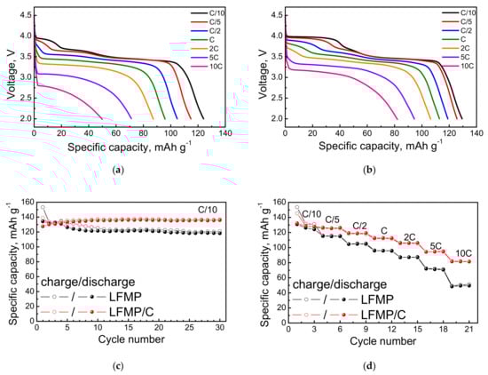 Discharge profiles of LFMP (a) and LFMP/C (b) vs. cycling rate in the 2.0–4.5 V range; charge/discharge capacity vs. cycle number (c) and cycling rate (d).