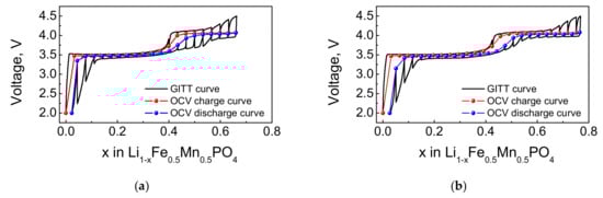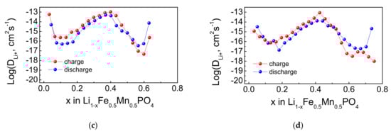 Figure 6 shows the GITT and OCV curves (Figure 6a,b), and the calculated Li+ diffusion coefficient DLi+ (Figure 6c,d) as a function of the cell voltage during charge and discharge of LFMP and LFMP/C at room temperature. It is clearly seen that the relaxation spikes on the GITT curves are very short in the middle part and become longer at the end of the charge/discharge processes. Accordingly, the values of diffusion coefficient DLi+ are almost identical for both samples and have the maxima of 10−13–10−14 cm2·s−1 at the bend of two plateaus.