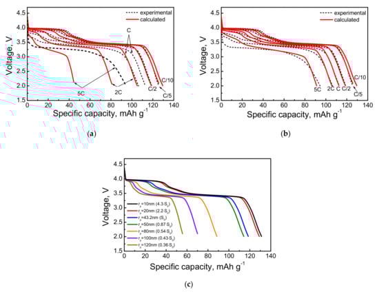 Comparison of calculated and experimental curves of LFMP/C with a constant coefficient of solid-state diffusion (a) and taking into account the temperature dependence of the diffusion coefficient (b); calculated discharge curves at 0.5C current for different values of the specific surface area and associated values of particle radii, where S0 is the value of 32 m2·cm−3 measured for the active cathode material (c).