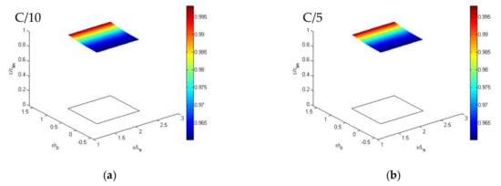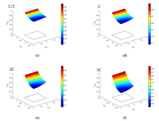 Figure 8a–e shows the profiles of dimensionless lithium concentration over the cathode thickness and the particle radius for different discharge currents. Obviously, as the current increases, the uneven distribution of lithium increases with both the cathode thickness and the particle radius.