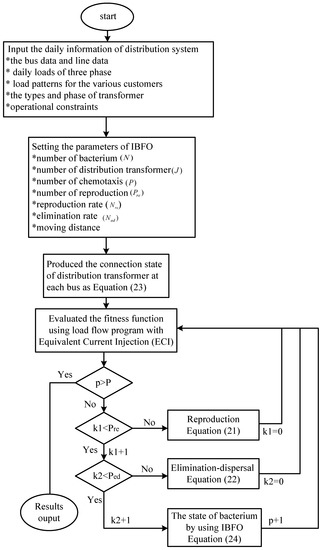 The problem for the phase arrangement of a distribution transformer can be formulated as a non-linear mixed-integer combinatorial optimization problem, which can be obtained by a complete enumeration of all feasible combinations. It involves high complexity in the search space, which manifests itself in the form of complicated constraints imposed on variables and the probable large number of variables in the searching process. To determine the best operating system, an efficient tool is needed to solve this problem. The purpose of this paper is to propose an improved bacterial foraging algorithm (IBFO) as a new approach in solving the optimal phase arrangement of the distribution transformers problem. Bacterial foraging optimization (BFO) is a nature-inspired optimization algorithm, which introduces the foraging behavior of bacteria based on competitive–cooperative mechanism [14]. In the past, BFO was successfully applied to various fields of power system optimization [15,16,17,18,19]. Improved BFO has also been successfully applied to optimize some problems in engineering and scientific fields [20,21,22,23,24]. The integration of gradient particles swarm (GPSO) and BFO was proposed to solve the optimization of distributed generation [20]. The standard benchmark problems with a large number of local optimal solutions are used for examples and solved by Chaotic BFO [21] and effective BFO [22]. Particle swarm optimization and BFO were integrated to solve the optimal schedule strategy for the active distribution network problem [23]. A GA-BFO algorithm was proposed to improve the security of the heterogeneous network routing protocols [24]. By combining BFO and stochastic weight trade-off (SWT) [25], this paper proposed another version of IBFO in order to refine the solution quality. For the first time, the proposed IBFO is applied to the phase arrangement of distribution transformers. A three-phase load flow program with the equivalent current injection (ECI) [26] is used to analyze the effect of the IBFO on a practical distribution feeder. Simulation results can help operators to improve the system unbalance and voltage profile, as well as enhance the operating efficiency of the distribution system.