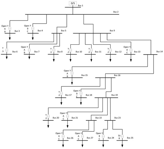 In Taiwan, the Taiwan Power Company (Taipower) usually uses two single-phase transformers to connect to an Open-Wye/Open Delta transformer for serving both the single-phase and three-phase loads, and it is more economical for transformer management [1]. In Taipower distribution system, there exist a number of Open-Wye/Open-Delta transformers for the sake of economic and future expansion considerations [2,3]. A distribution feeder inherently produces the three-phase unbalance due to the lack of a third transformer and the two kinds of load served. This causes the phase voltage and current along a distribution feeder to become unbalanced. The unbalanced situations will lead to extra line losses, communication obstruction, and shorter service life of equipment [4,5]. A serious issue is that the grounding relay will trip due to the phase unbalance. The power quality and operation efficiency in the distribution system will also be reduced.