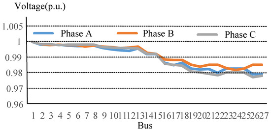 The three-phase voltage profiles of each bus after phase rearrangement at the light load period.