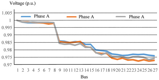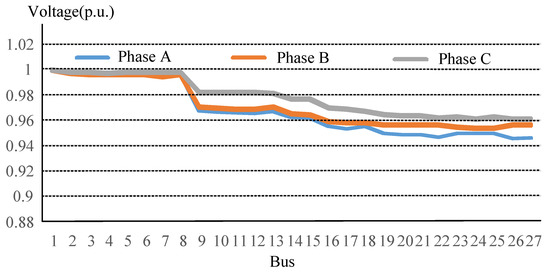 Figure 6 and Figure 7 show the three-phase voltage profiles of each bus before and after the phase rearrangement at the heavy load period (2 pm), respectively. In Figure 6, the minimum voltage of phase A is about 0.943 p.u., which violates the operational constraints. After the phase rearrangement, the minimum voltage of phase A is promoted to 0.976 p.u. and the three-phase voltage profiles of each bus are simultaneously improved to safe operation.