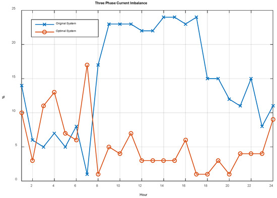 Figure 8 demonstrates the daily system unbalance profiles at the swing bus (bus 1) and Figure 9 is the total line loss profiles at each hour. The unbalance factor between 9 am and 5 pm is much larger than the other periods. The unbalance factor at the peak load was from 23%–24% to 2%–7% by using the phase arrangement of distribution transformers. In Figure 8, it is clearly observed that phase rearrangement introduces a lower unbalance factor than that without phase rearrangement. At the same time, the total line loss is improved and total line loss was also reduced from 980.09 kW to 659.01 kW.