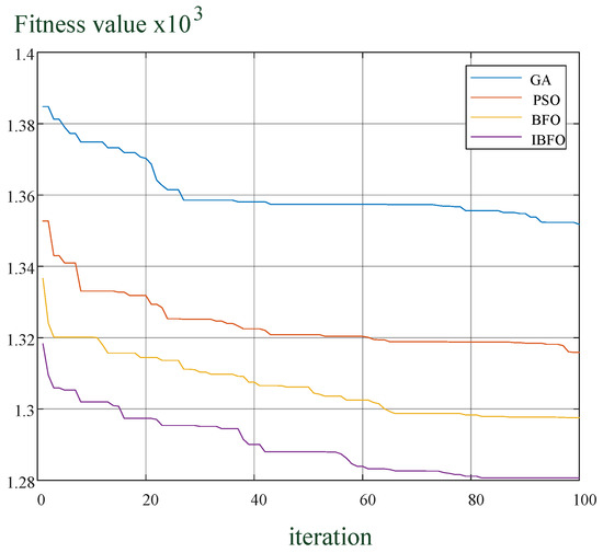Figure 10 illustrates the convergence characteristics of GA, PSO, BFO, and IBFO. The tests were carried out on an Intel i5-7300HQ 2.5 GHz CPU and 16 GB DRAM memory. We set 100 iterations as the stopping condition for each algorithm. In Figure 10, the fitness value of IBFO can converge to a lower value than other algorithms. The operational time of the IBFO is slightly longer than that of the BFO but faster than GA. Regarding the calculation stability of the optimal solutions, IBFO reach convergence after about 82 iterations and has better convergence than the other algorithms. Table 4 shows the maximum, minimum, and average optimized loss with 100 test runs. In the 100 times of repeated resilience testing, the average converged loss of IBFO, BFO, PSO, and GA are 730.84 kW, 761.16 kW, 826.08 kW and 869.46 kW, respectively. It shows the capacity of IBFO to explore a more likely global optimum than other algorithms. The results show that it is better than the PSO, BFO, or GA, which demonstrates that the IBFO is best.