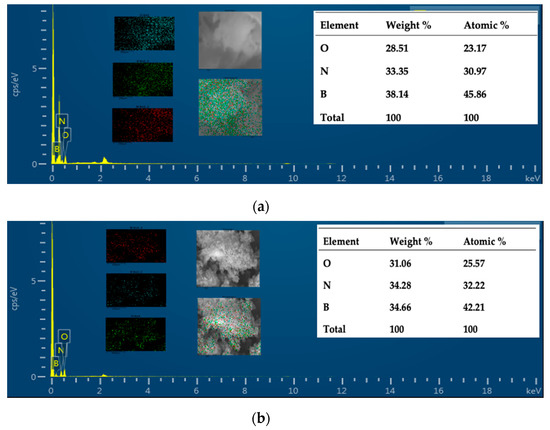 The morphology of samples was studied using scanning electron microscopy (SEM). The pristine BN exhibited an ultrathin flake-like morphology, as displayed in (Figure 1a,b). BN-P123 presented a cloud-like sheet structure with interconnected network of porous structure (Figure 1c,d). Moreover, the formation of pristine BN and BN-P123 were studied by EDX and elemental mapping (Figure 2a,b). It is obvious that the product is mainly comprised of boron (B), nitrogen (N) and oxygen (O). As shown in Figure 2b, BN-P123 has very little increase in oxygen content compared to pristine BN. This is due to the introduction of P123 into BN formation.