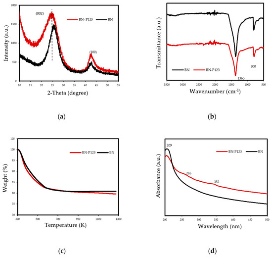 The structure of samples was analysed and Figure 3a depicts the XRD patterns of the prepared samples. The results show two characteristic peaks around ≈25° and ≈42° which are attributed to the (002) and (100) crystal planes of hexagonal boron nitride, respectively [30]. Additionally, the peaks of both samples confirmed the poor crystallization with the presence of turbostratic material. Compared with pristine BN, the (002) diffraction peaks of BN-P123 shifted to a lower angle, which promote more disordered hexagonal boron nitride (h-BN) structure. More details of the chemical features were supported by Fourier transform infrared (FT-IR) spectroscopy and the results are shown in Figure 3b. All peaks exhibited two main characteristic bands of boron nitride at ≈1365 and 800 cm−1 corresponding to in-plane B-N transverse optical mode and out-of-plane B-N-B bending mode, respectively [31]. No major chemical differences could be observed between the samples. Thermal stability of samples was performed in air atmosphere (rate = 10 K/min) and shown in Figure 3c. The TG thermograms reflected the weight loss of 19% for both samples, representing the removal of moisture adsorbed on the material surface. After 573 K the lines show the thermal stability nature of BN at high temperature and there was no significant weight loss up to 1273 K. The UV-vis absorption collected in Figure 3d indicates a highly transparent from visible to UV wavelength [32]. The maximum absorption peak around 209 nm, is attributed to intrinsic excitation absorption band of h-BN. Besides, small humps around 265 and 352 nm were detected in BN-P123, corresponding to impurities. So far, above all characteristic results on both samples, it was found that the structure and chemical nature of BN has not changed after modifying BN with the surfactant compound and both samples revealed almost similar features. We assumed that the utilisation of block copolymer (P123) might affect the textural properties of pristine BN.