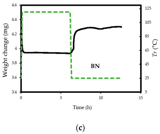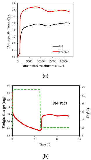 Due to the relatively large porosity of samples, the modified sample BN-P123 and pristine BN were assessed for CO2 capture under ambient conditions. The adsorption capacities of pure CO2 on pristine BN and BN-P123 were determined by thermogravimetric analysis. Prior to the sorption test, samples were dried at 393 K with a heating rate of 10 K/min from 298 K under flowing N2 (150 mL/min) for 6 h and then allowed to cool to the temperature at which the sorption is carried out at 298 K with a heating rate of 10 K/min. When the sorption temperature was reached, samples were stabilized under flowing N2 (99.99%, 150 mL/min) for 15 min and then N2 flow was switched to pure CO2 (99.99%, 50 mL/min) flow for 6 h. The mass uptake during this stage was interpreted as the CO2 capture capacity. Figure 5 and Figure 6a–c illustrate the setup of experiments and the TG profiles of CO2 uptake along with weight change results respectively.