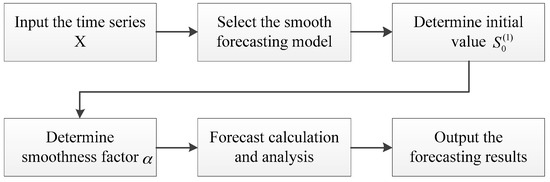 Exponential smoothing is a classical time-series prediction method with a small sample, which is widely used due to its high operability. SES eliminates the random fluctuation in the historical statistical sequence and finds the main trend of its development. It is suitable for simple time series analysis and short- and medium-term prediction. Figure 4 shows the flow chart of the SES model.