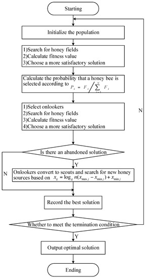 The ABC algorithm is a random search meta-heuristic global optimization algorithm, which divides worker bees into three categories: Employed bees, onlooker bees, and scout bees [65]. Employed bees and onlooker bees are used for mining honey sources while scout bees search for new honey sources. The location of nectar sources is the result of the optimization problem. First, a group of initial solutions (honey source) are randomly generated from the feasible domain, and all employed bees conduct a domain search. Second, the scout bees randomly search the honey source and record the current best solution. Then, the onlooker bees choose honey sources according to some strategies and conduct a random search to record the best solution. Finally, the honey source that falls into the local optimal point is replaced by the randomly generated honey source, and the global optimal solution is finally obtained after several iterations [66]. Figure 6 shows the schematic of the ABC algorithm.