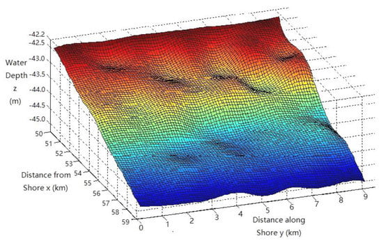 The OWFs are usually built 2‒120 km from the shore where the water depth is around 2‒50 m. The distance from the OWF studied in this paper to the coast was 50 km, and the water depth was approximately 42‒45 m. As a seabed is generally not a completely smooth and even surface, it is supposed to have a slight slope with a rugged surface to simulate the real situation. The peaks function in MATLAB (2018b, Mathworks, Natick, MA, USA) was used to construct such a 3D seabed, as shown in Figure 1.