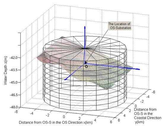 - A three-dimensional seabed model is built to simulate the real submarine situation. The designed OWF is assumed to have a circular shape, and the OWF numerical analysis is carried out based on the cylindrical coordinate system. This assumption is beneficial for the reduction of the wake effect between WTs and the simplification of the substation location decision.