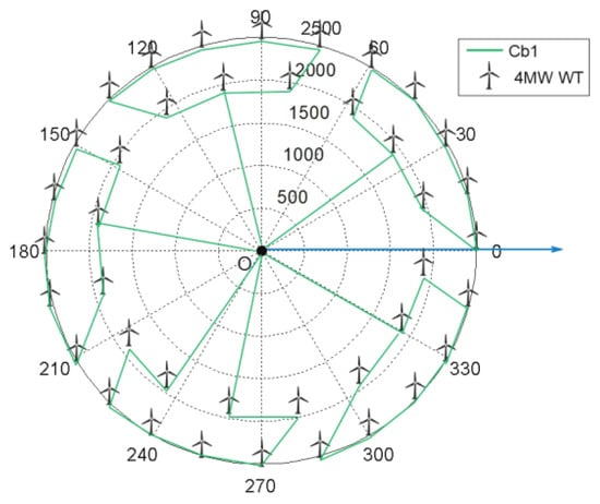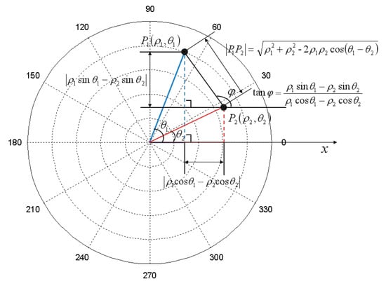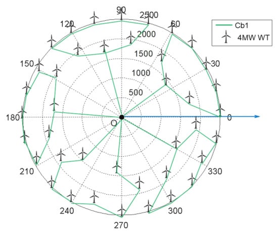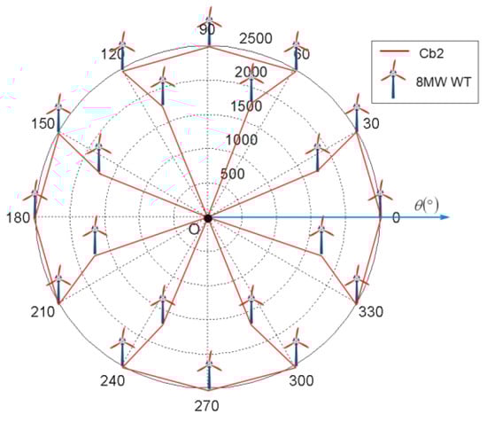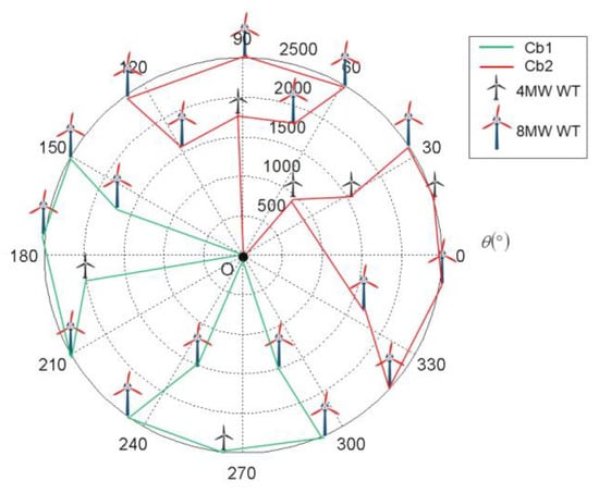 As shown in Figure 3, the projection points of two WTs on the x-o-y plane are denoted as and , respectively, where and are the distances from the origin to and and and are the angle offsets from the positive axis. Then, the distance and angle between the two points are calculated as: