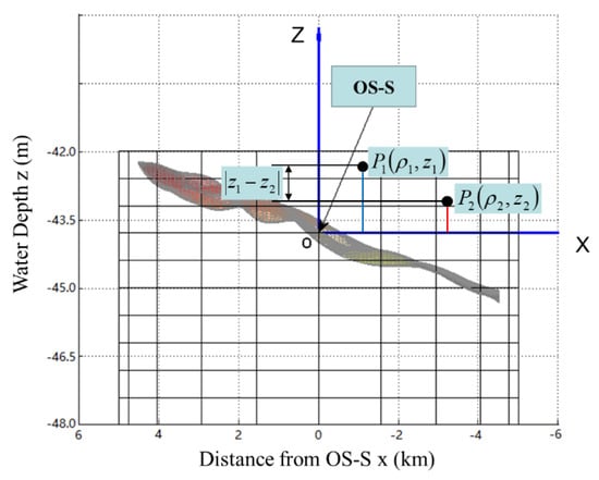 Taking into account that the OWF layout pattern was a circle and the water depth varied in the vertical direction, the model of the OWF was built in a cylindrical coordinate system for analysis. As delineated in Figure 2, the location of the offshore substation (OS-S) was set to be the origin, and each WT’s coordinate is denoted as . The axial distance is the Euclidean distance from the z-axis to the point . The azimuth is the angle between the reference direction on the reference plane and the line from the origin to the projection of on that plane. The axial coordinate is the vertical distance from the reference plane to the point . Because the surface function of the seabed was predefined, if the and coordinates of any WT were given, the altitude coordinate of the WT could be directly obtained.