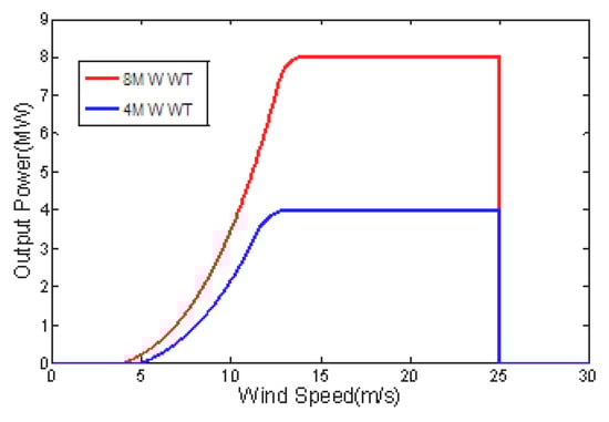 Theoretically, arbitrary types of WTs can be implemented in an OWF. In order to avoid the complexity of computation and analysis, this paper selects only two typical WTs that are widely used in real OWFs, namely the Vestas V164 8 MW WTs [19] and the Siemens SWT-4.0-130 4 MW WTs [20]. The parameters and power curves of those two kinds of WTs are given in Table 1 and Figure 5.