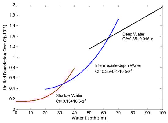 Relationship between WTs’ foundation cost and water depth [12]. Reproduced from [12], the name of the publisher: IEEE.