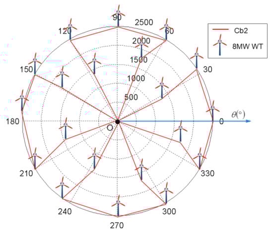 Among the operational OWFs, the majority are composed of an identical type of WTs arranged in symmetrical and array-like layouts. As reference cases, this paper puts forward four baseline designs with the same total capacity (160 MW), but each of them consists of different types of WTs. The first one is composed of 40 Siemens 4 MW WTs with Cb1 (Figure 8), and the second one is composed of 20 Vestas 8 MW WTs with Cb2 (Figure 9), occupying the same area (a circle with a radius of 2500 m). For comparison, the layouts of an OWF that has the same total capacity, but occupies a rectangle area with a size 5166 m by 4018 m are shown in Figure 10; Figure 11, respectively. The layout and spacing between WTs were in the similar manner as in Horns Rev 1 WF [21].