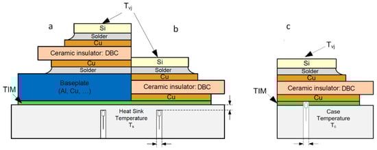 Power device on a cold plate. (a) Semiconductor die on direct bonded copper (DBC) in a module with a baseplate. (b) The DBC is directly attached to a heat sink. The heat sink temperature is measured. (c) The DBC is directly attached to the heat sink. The lower DBC surface temperature is measured. The optional sensor positions are shown as prescribed in Reference [16] (Courtesy of ECPE).
