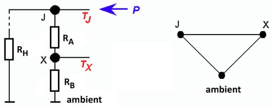 In Figure 2 we cumulated all threads of the heat flow in a usual power device package structure into a thermal network equivalent. The heat is supposed to be generated at the point J. The part of the material through which the heat flux flows from the junction towards an X reference surface is represented by an RA thermal resistance; the next part where the flux leaves X towards the ambient is denoted by RB. A portion of the heat does not flow through X, and the corresponding portion of the assembly is cumulated into RH.