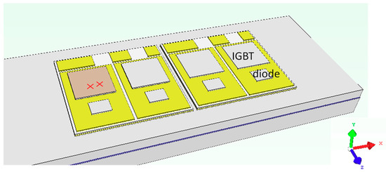 The IGBT chips were 11.2 mm × 11.2 mm in size, and this dimension is of interest for treating the displacement-related errors. The layers of the assembly were approximately the ones shown in Figure 1a. Under the silicon chips, a laminate of solder, copper, and ceramics layers was attached to an aluminum base plate. The cold plate was modelled with a constant heat transfer coefficient (HTC) of 3000 W/m2K which is a realistic value for an aluminum surface with internal water cooling.