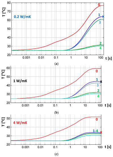 The figure also indicates that the external monitor points reacted on the power change with a 0.5 s delay; accordingly, also in a live system, a slow data acquisition of the reference temperatures with a few samples measured in a second was appropriate. One can observe that more intensive cooling resulted in earlier stabilization of the temperature, and steady state was approximately reached at 140 s, 50 s, and 30 s for the interface layers of 0.2 W/mK, 1 W/mK, and 4 W/mK thermal conductivity, respectively.