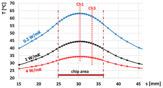 Another informative chart presents the typical bell-shaped temperature distribution of the case_bottom/TIM_top interface in steady state (Figure 5). The peak temperature under the chip center corresponds to the final transient value at Ch1, shown as a blue “x” marker for the “dry” assembly in Figure 4a and as black “x” and red “x” markers in Figure 4b,c, respectively, for different TIM qualities. Note the large temperature difference even within the chip area.
