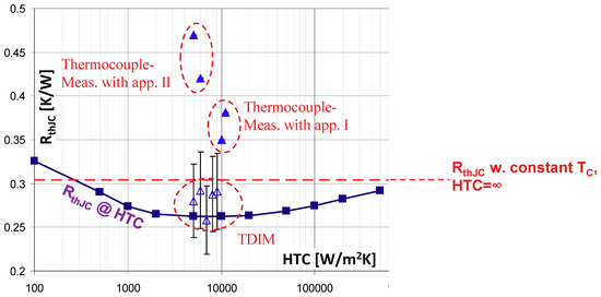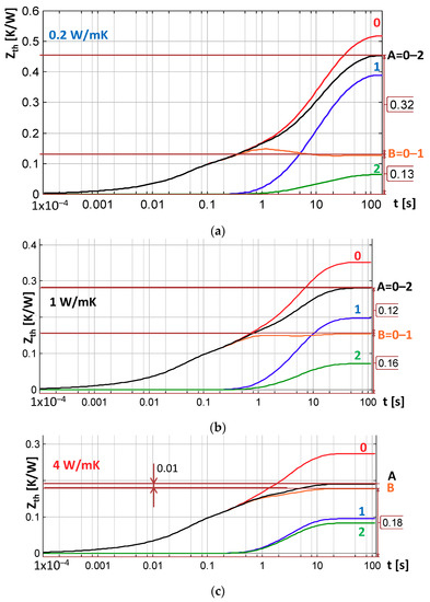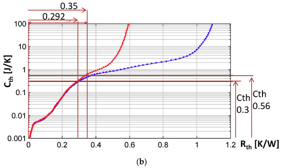 Measuring separately the junction and an external probe yields RthJC = 0.13 K/W junction to case thermal resistance if the probe penetrates the TIM, and RthJC = 0.45 K/W if the probe just touches the lower surface of it (“B = 0–1” and “A = 0–2” in Figure 6a, respectively).