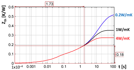 Zth curves at thermal conductivities of the TIM at 0.2 W/mK, 1 W/mK, and 4 W/mK.