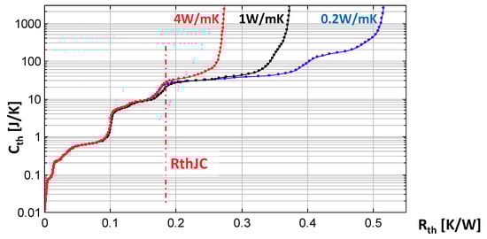 Structure functions with thermal conductivities of the TIM at 0.2 W/mK, 1 W/mK, and 4 W/mK. Junction to case thermal resistance is shown.