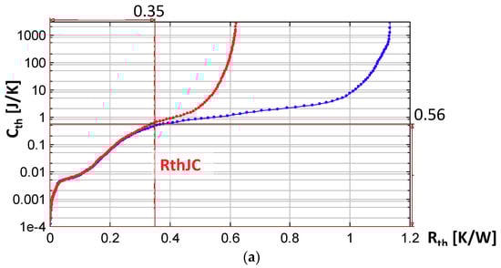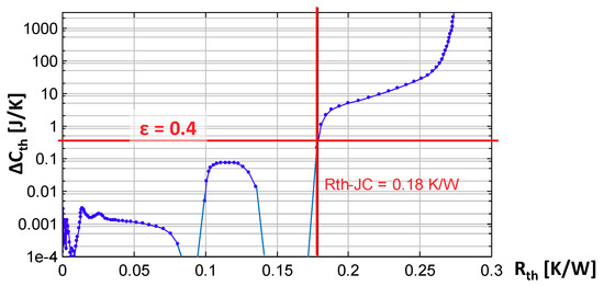 Figure 10 presents the difference of the structure functions in Figure 9. The figure demonstrates that selecting a threshold between 0.05 J/K and 2 J/K, being of a ratio of 40, we can state that the RthJC junction to case thermal resistance is between 0.17 K/W and 0.19 K/W. In real cases with actual measured transients instead of simulated ones, this difference is less steep, as shown in Reference [23], but still gives a sharp detection of the RthJC quantity.