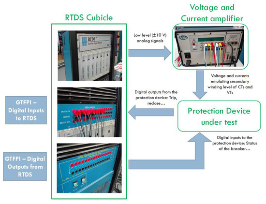 The analysis of commercial protection devices has been performed by using the hardware in the loop connection between RTDS, amplifiers, and protection devices as shown in Figure 1. RTDS allows to study, in real time, the behavior of a physical protection relay in laboratory as if the relay was connected in a real substation. Power system is entirely modelled in RTDS, which runs the Electromagnetic Transient (EMT) simulation in real time, sending analogic signals to the protection relay (voltage and currents) using amplifiers and receiving the digital signals from the protection (trip, reclose…) so that the dynamic performance of the real protection can be studied in the simulated scenario.